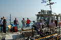 Project PIs waiting to board the drilling rig. From left to right - Norbert Nowaczyk, Achim Brauer, Steve Goldstein, Emi Ito, Dennis Nielson, Zvi Ben-Avraham, Science Reporter Eitan Haddok, Vessel Operator Ofir Zuckerman.