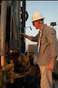 ICDP's Uli Harms inspects a logging tool as it is pulled out of the borehole.