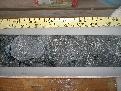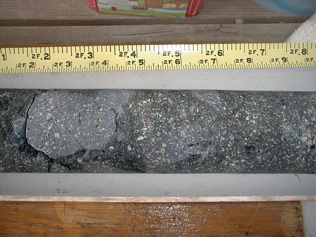 A sample of hyaloclastite. Moderately olivine-phyric basalt clasts sit in a dark green matrix of altered glass; unaltered glass is visible as brown patches.