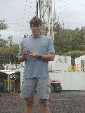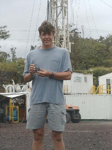 Toby Hewitt poses with the mile rock that was cored out over the night and marked and boxed today.
