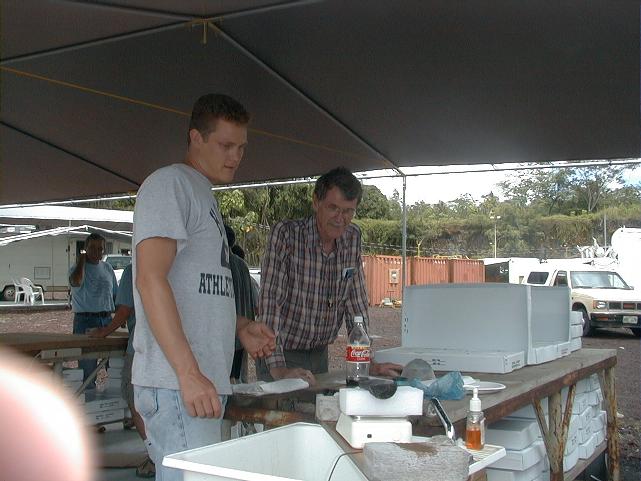 UN_jim_1.jpg | Dave Whilldin assists Jim Moore in weighing core in order to obtain density measurements of the hyaloclastite. | 0 - 0 |