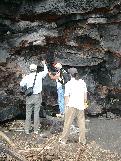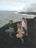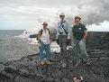 Angie, Jim and Fran stand on a recent lava flow with the ocean entry in the background.