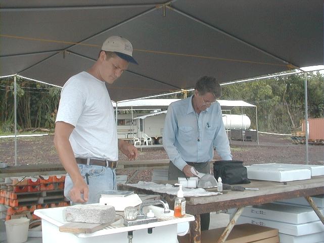 Dave and Jim work diligently, taking specific gravity data from every box of core.
