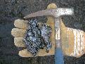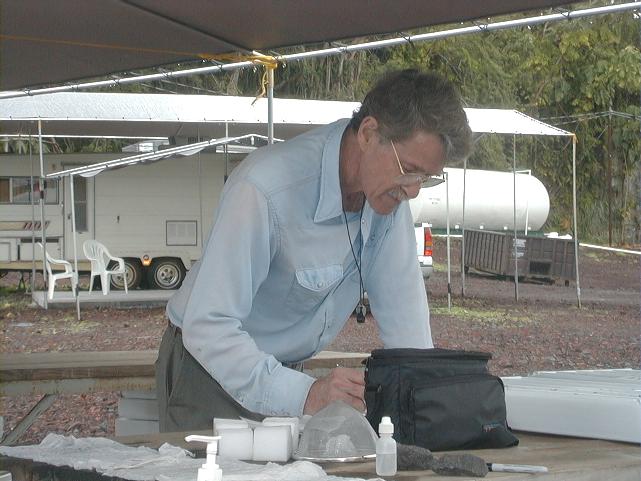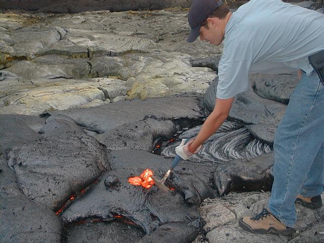 Doug scoops fresh lava with a rock hammer.