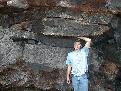 Super-volunteer Doug Hutcheon single-handedly supports an enormous basalt overhang.