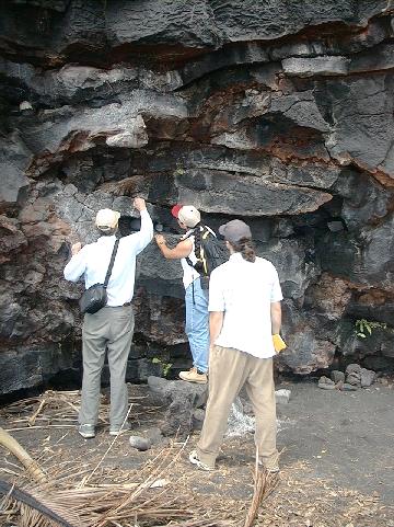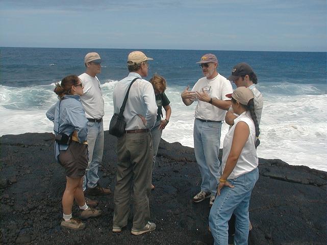 Mike Garcia leads a group discussion on hyaloclastite at a beach near Kalapana during our field trip.