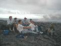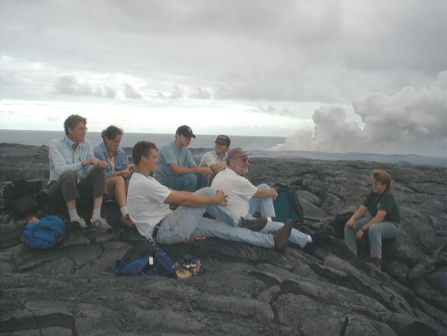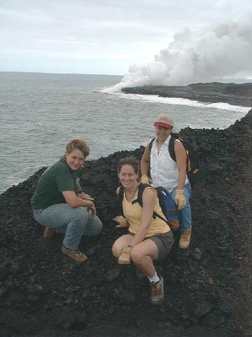 Angie, Rachel and Fran atop the littoral cone with the steam from the ocean entry behind them.