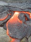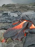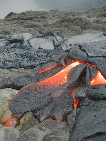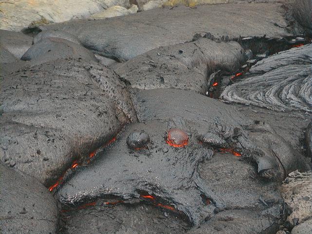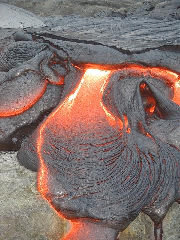 This picture shows just how ropey pahoehoe forms. The brightest part of the fresh lava is about 1,100 degrees celcius.