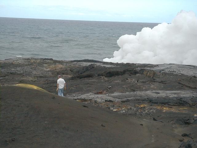 Mike cautiously treds out on a lava bench toward the ocean entry. Benches are deltas formed by cooled, hardened lava at an ocean entry.