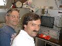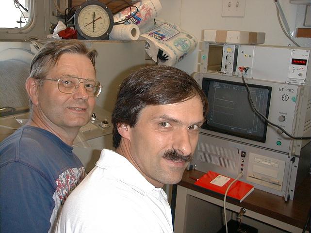 Erich (left) and Martin view data being recorded by the magnetometer at the surface.