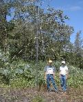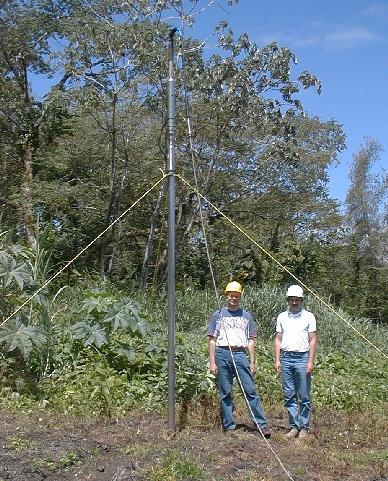 Erich Steveling (blue shirt) and Martin Leven (white shirt) stand next to the borehole magnetometer (@ 5 meters tall)