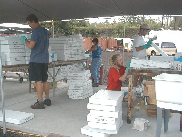 The geology crew reconditions old archive boxes into new working boxes.