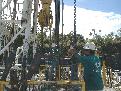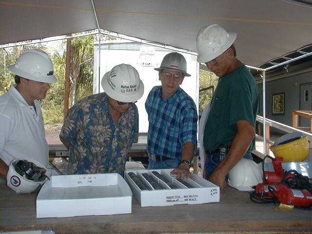 A group from Barnwell Industries visited the drill site today. Don and Mike look over some core with Russel Gifford (far left) and Morton Kinzler (second from left).