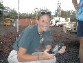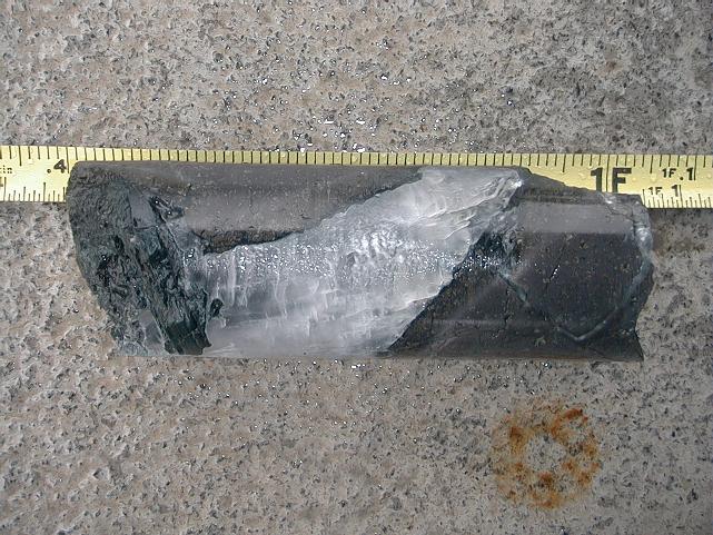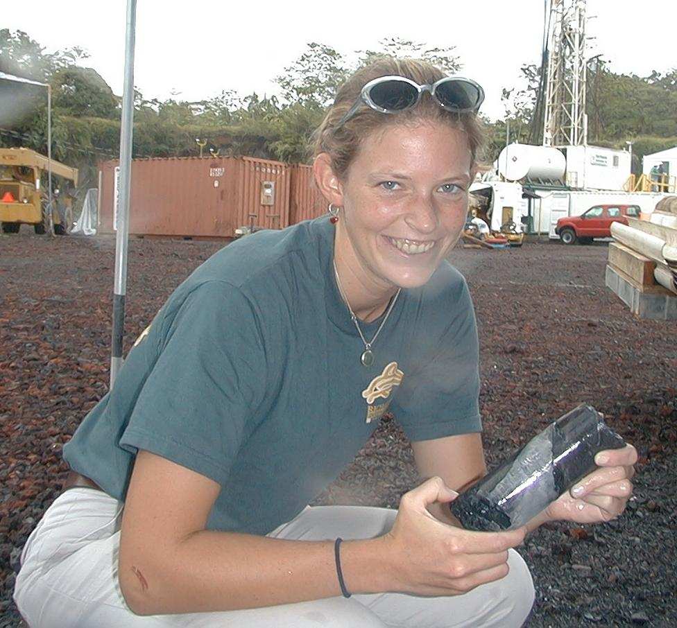 Caroline Seaman displays the core containing gypsum between two basalt pillows.