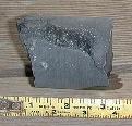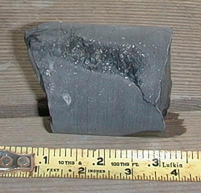 Aphyric basalt that is possibly part of an intrusion, with an inclusion of highly olivine-phyric basalt similar to the basalt on either side of the aphyric section.