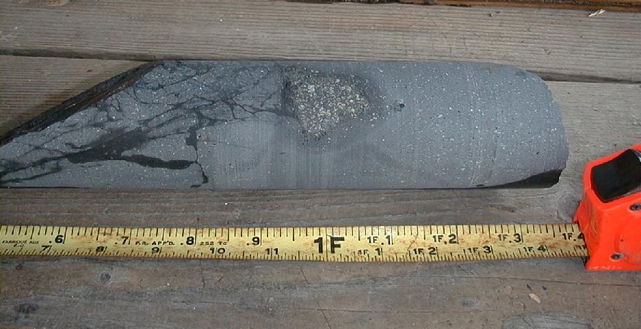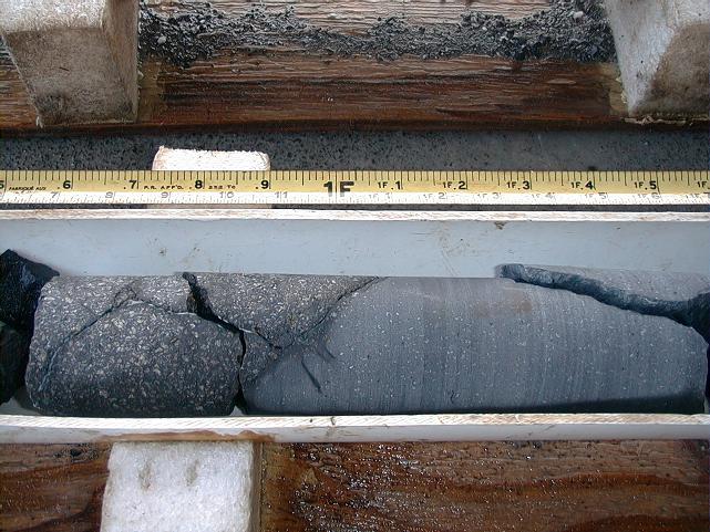 Sparsely olivine-phyric basalt overlies highly olivine-phyric basalt.