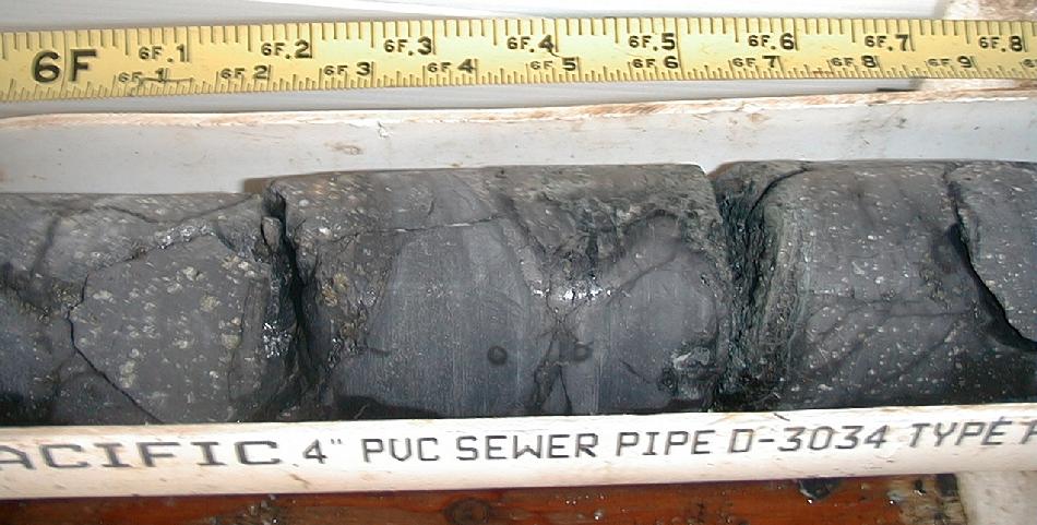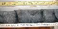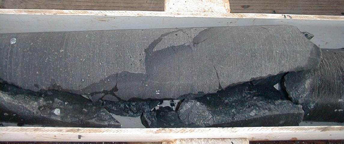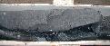 Band of aphyric basalt at glassy margin separating two highly olivine-phyric pillows.