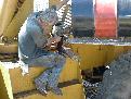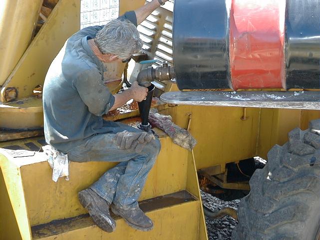 Dan fills up the pump hydraulic system with oil.
