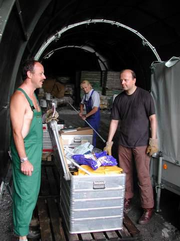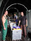 The crew unpack the boxes after the arrival at the drillsite.