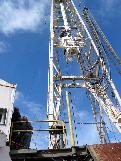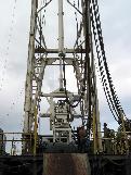 Engineer Marshall Pardey looks up at derrickman Shorty as he works on the hydraulic Top Drive.