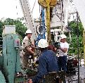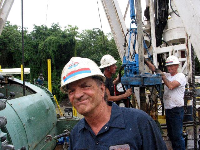 Bo smiles as Shorty and Bill attach another piece of pipe onto the drill string