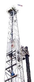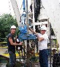 Dan and Bill clamp onto pipe while Bo readies himself to raise the drill string 90 more feet