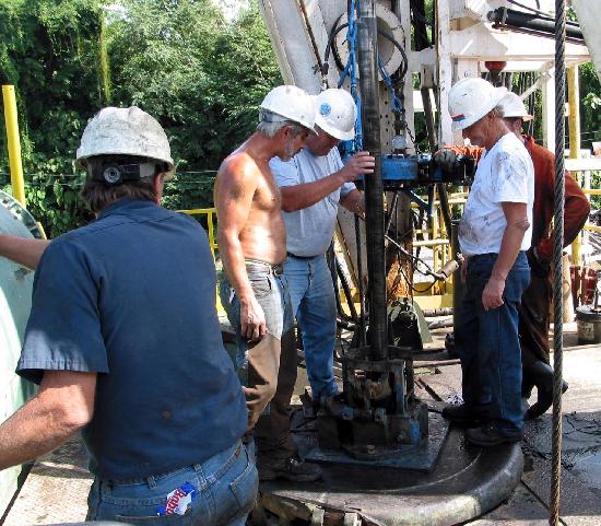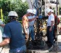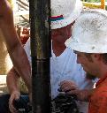 Engineer Bruce Howell (second from left) and the drillers gather around in anticipation of the emergence of the core barrel