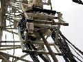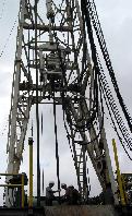 Looking up from the catwalk at Bill, Shorty, and Dan attaching another length of pipe
