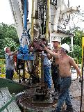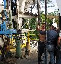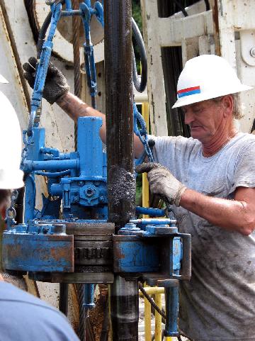 The drillers work rearrange their equipment as they prepare to trip out of the hole