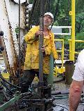 Paul waits in the rain for the arrival of the core barrel at the surface