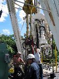 As pipe is lowered into the hole, the elevators are released at the drilling floor and raised to the top of the next segment of pipe