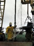| UN_Joseph_Pouring_Out_HSDP-2b_1.jpg | Joseph lets the last of the water contained in the 90-foot length of pipe pour out onto the drilling floor. It’s a wet job, but someone has to do it! |