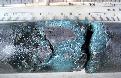 This glassy margin is filled with a blue-green clay that we believe may be smectite. The rock and clay were wet when the photo was taken, the clay has a much more dull color when it dries.