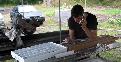 Fred closes a business deal on his cell phone while marking the core that he has just slabbed.