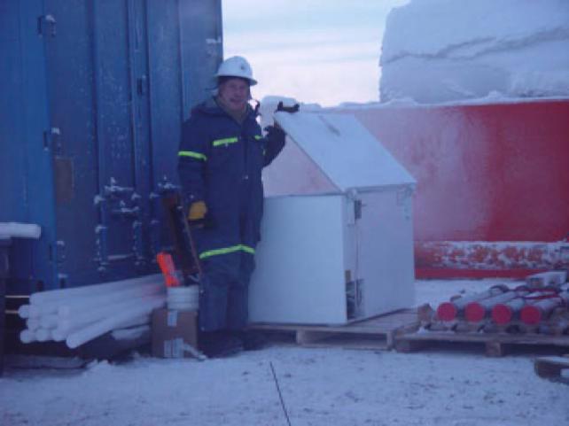 Scientific freezer being deployed at -30C at the rig site. Also note the 1m long pressure vessels on the right of the freezer. Hopes are high for the hydrate coring!