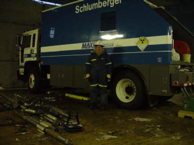 Schlumberger wireline unit and logging tools in truck shop. Schlumberger’s Maxis Express logging truck with suite of tools planned to be deployed in permafrost logging run.