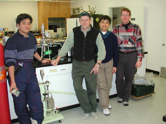 In the Laboratory of the Inuvik Research Center, from the left to the right: Toshiharu Okui (JNOC), Fred Wright (GSC), Heilung Lu (JNOC), Mike Riedel (GSC)