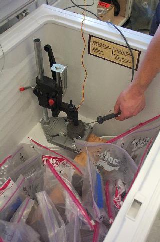 First test of measuring electrical resistivity sample containing gas hydrate. After the test the sediment around the electrode probes was altered. At the contact points of the electrodes