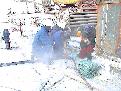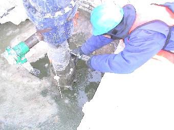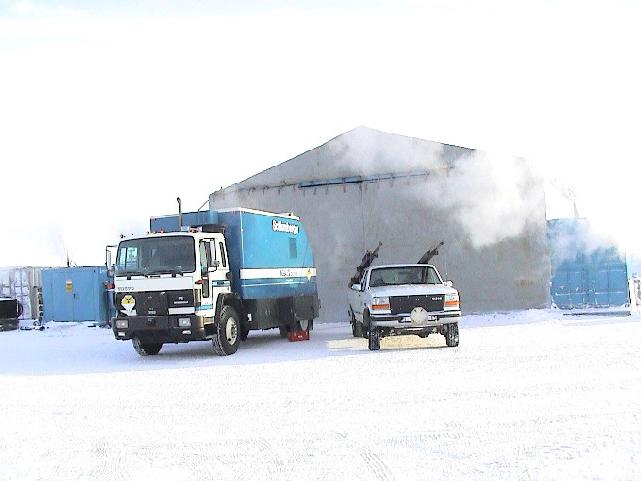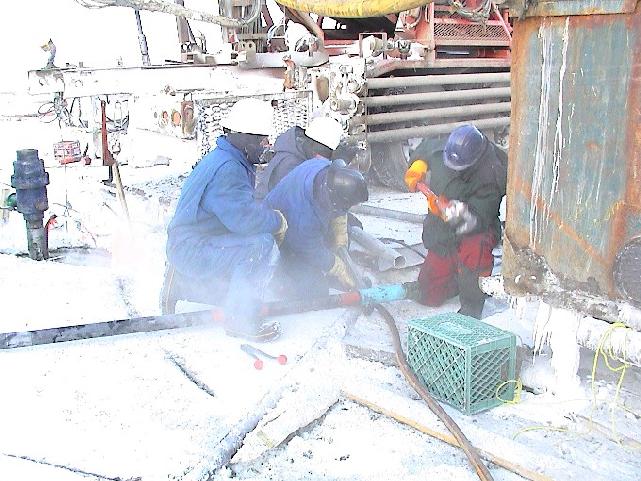 Eckhard Dahms (GFZ) taking a sample of upward migrating gas around the casing of Mallik4L-38 after the re-opening of the borehole. The sample was instantly analyzed with the