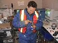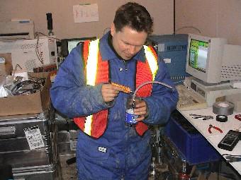 Eckhard Dahms building a funnel for gassampling in the gaslogging-shelter showing the masspectro-meter and the gaschromatograph in the background.